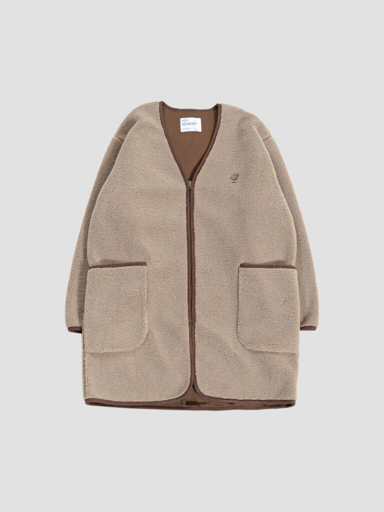 抜け感のあるVネックは、タートルネックやボリュームスカーフとも好相性。裏地には風を通しにくいムートン生地を使用し、暖かさもしっかり。パイピングや大きめポケットなど、さりげないディテールも魅力の1着です。