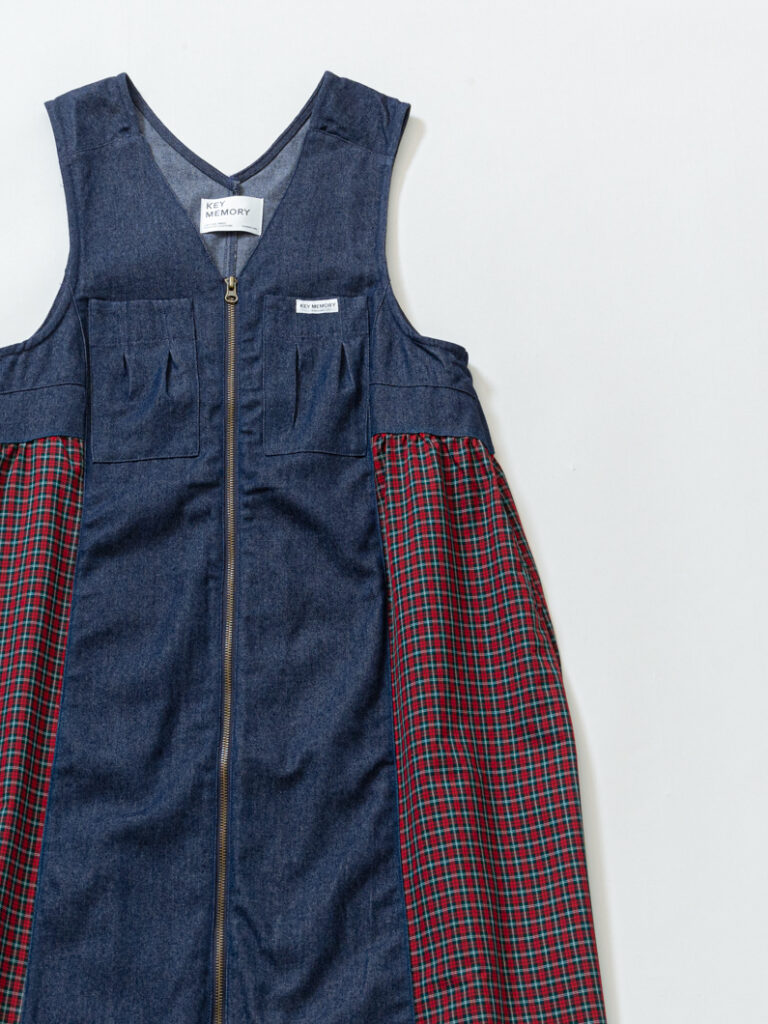 【オンライン限定】ロングジレとしても、ワンピースとしても着られる、スタイリングのアクセントになる1着!Vネックのジャンパースカートデザインをベースに、首元はすっきり見え。ニットやスウェット、Tシャツまで合わせやすいアーム設計で、華奢見えも叶います。フロントジップを開ければロングジレとしても着用でき、動きのある立体的なシルエットに。薄手のデニム生地とシャツ素材のチェック切替で、軽やかな着心地も魅力です。サイドからバックまで続くチェックデザインや、アンティーク調ジップなど細部までこだわったアイテム。