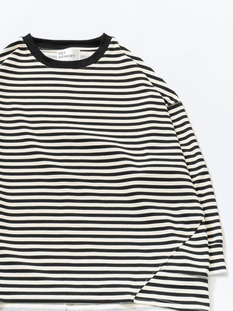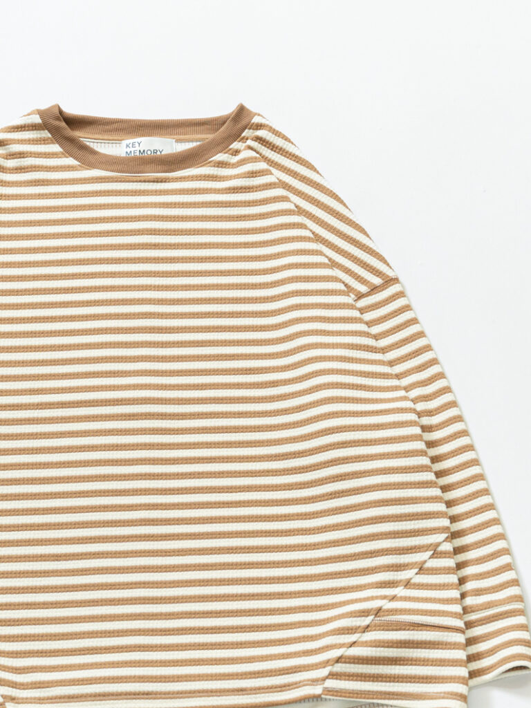 【オンライン限定】トレーナーとTシャツの“いいとこ取り”。季節の変わり目に活躍する、リラックス感たっぷりのストライプトップス。大人気のストライプトップスを伸縮性のあるワッフル素材でご用意いたしました。裏地はさらっと快適な着心地。スウェットほど重くなく、Tシャツより程よいハリ感があり、1枚でもレイヤードでも楽しめます。ゆったり身幅に裾を少し絞ったシルエットで、ルーズになりすぎずバランス良く。タートルやシャツを重ねたり、アウターのインナーとしても◎