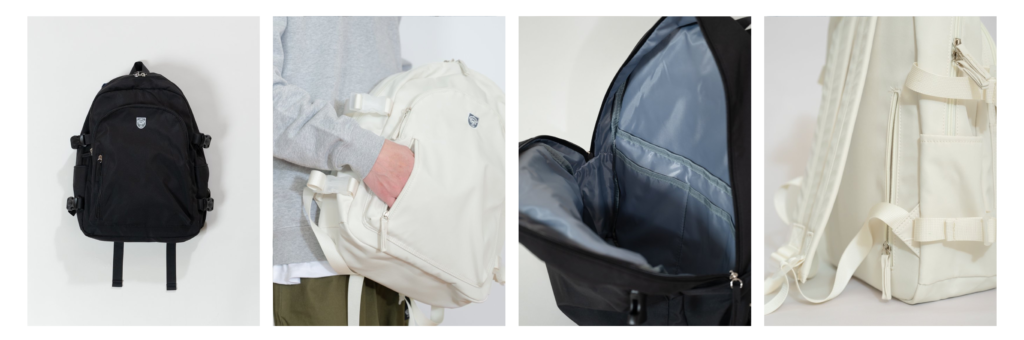前面の小物などが入るポケットが2つ。中についているセパレートポケットが3つ。サイドのペットボトルポケットが2つ。背面の隠しポケットが1つ。合計8つのポケットで、リュックの中身も探しやすく、すっきりと収納していただけます◎