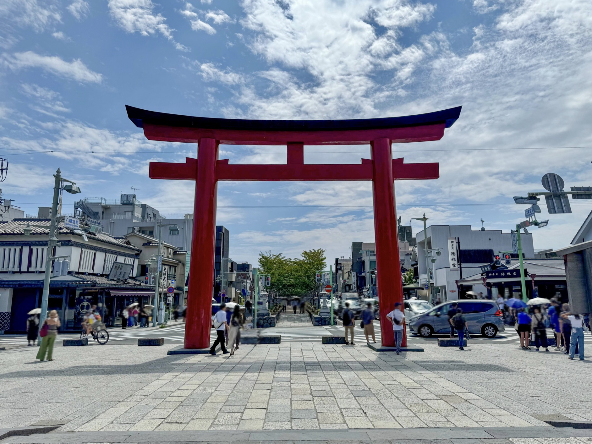 風情あふれる石畳を歩き、鶴岡八幡宮の入口に到着すると、鮮やかな朱色の三ノ鳥居が堂々とした姿で訪れる人々を迎えます。