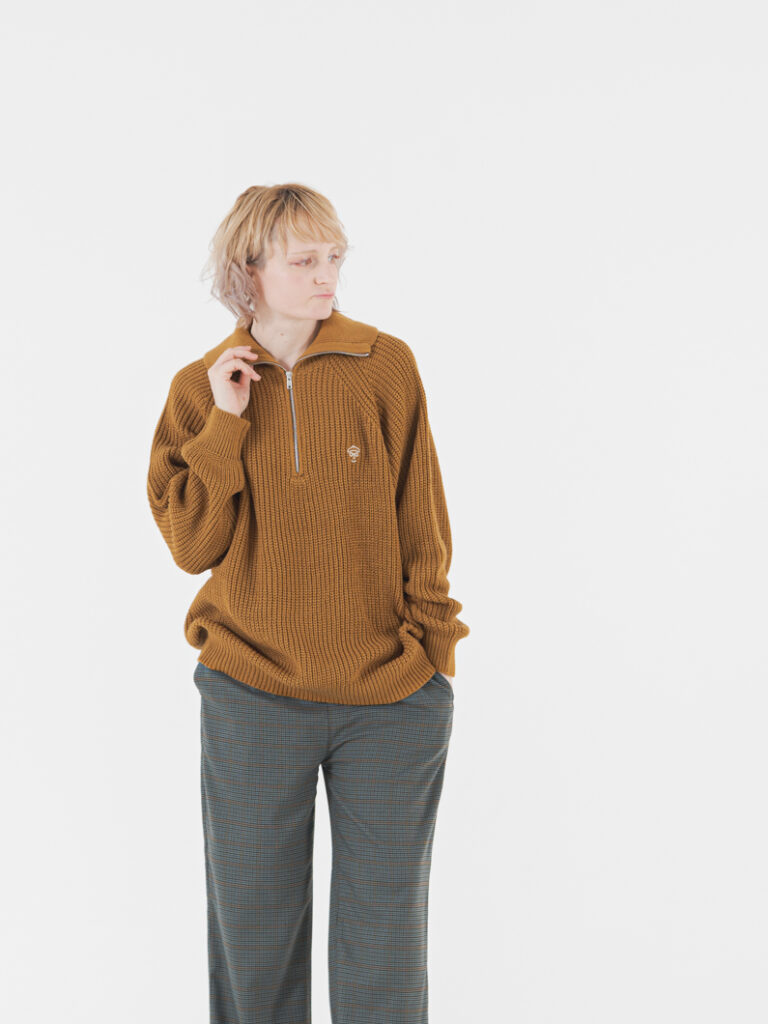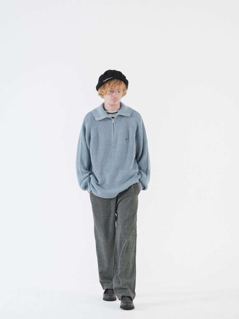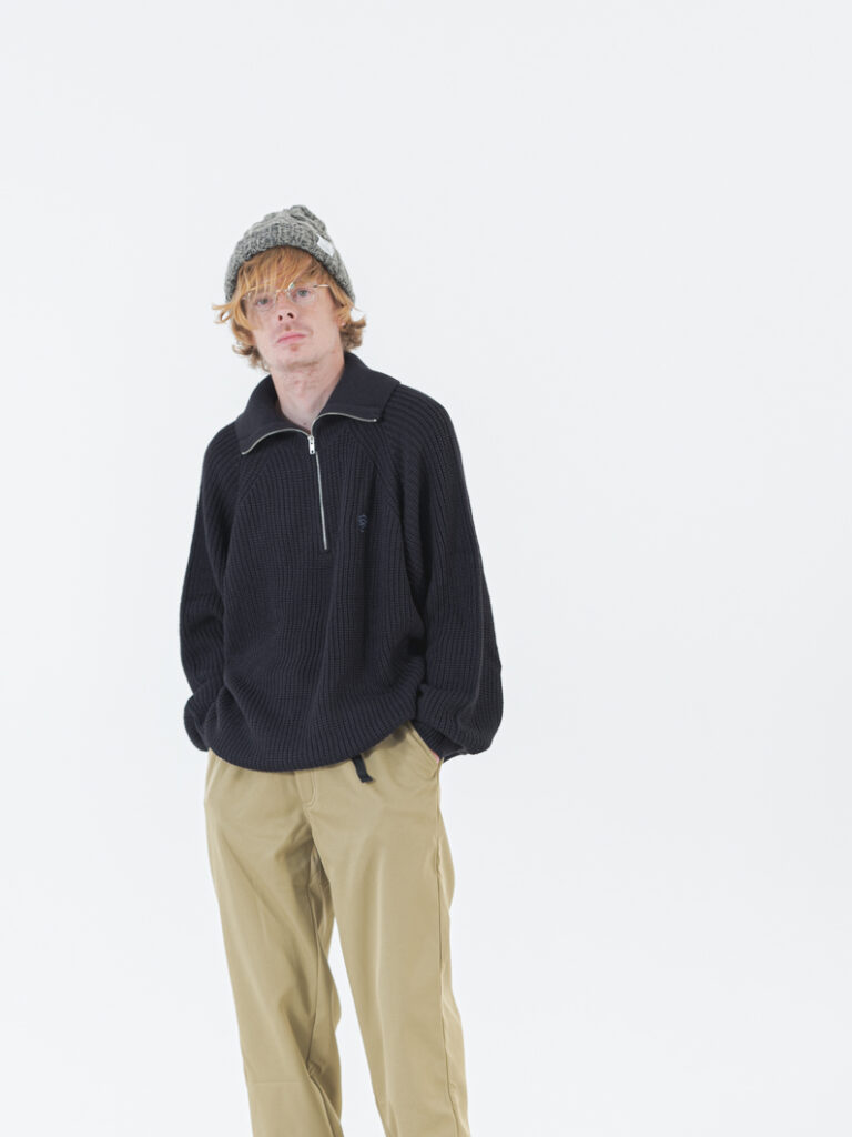 着るだけで様になるセーラーカラーのプルオーバーニット。冬のベーシックアイテムと合わせて、ワンポイントとしても活躍する1枚です。今年は懐かしさを残しつつ、ゆるっとしたサイズ感にアップデート。襟元のシルエットやジップの開け閉めで表情が変わり、軽やかな糸とチクチク感のない素材で快適に着用いただけます。袖口と裾は柔らかめのリブでまとまりをプラス。ユニセックス仕様でカラーもお好みで選べます。“Corduroy tuck pants”や“Wool like pants”とのコーデは冬のお出かけにおすすめで、ギフトやクリスマスプレゼントにも最適です。