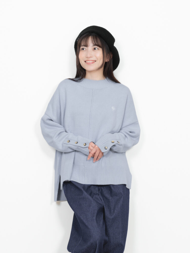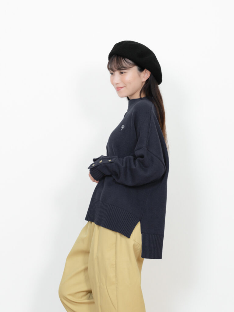 首元は高すぎないリブハイネックで、ハイネックが苦手な方にも取り入れやすいデザイン。裾は太めリブ+スリット入りで、腰まわりをすっきり見せてくれます。袖口のボタンとスリットが、さりげないアクセントに。綿×アクリル素材で、チクチクせずやさしい着心地も魅力です。カラーは NATURAL / NAVY / BLUE の3色展開。カジュアルにもきれいめにも使える、この冬頼れるニットです。