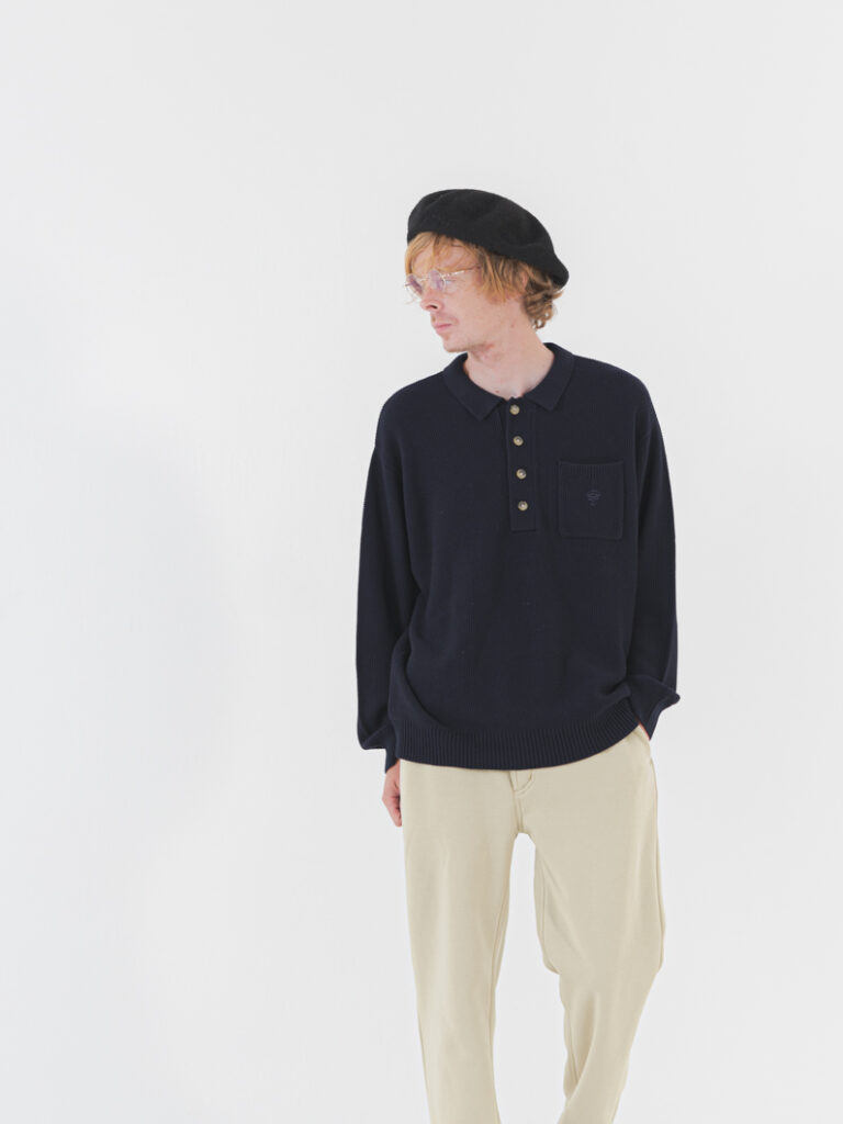 季節の変わり目にも活躍する、鹿の子ニットポロシャツ。夏にご好評いただいたポロシャツが、今回は長袖ニット仕様で、ユニセックスデザインとして新たに登場です。ベーシックなアイテムでありながら、どこか懐かしさを感じさせる長袖ポロ。鹿の子編みでさらっとした着心地ながら、ほどよくリラックス感のあるシルエットに。厚手になりすぎないよう、生地のボリューム感にもこだわったデザインです。襟付きできちんと感を演出しつつ、ニットならではの柔らかさもある1枚。袖口と裾はリブ仕様で、すっきりまとまりのある印象に仕上げました。胸元のボタンにはマーブルデザインを採用し、さりげないアクセントをプラス。ボタンを開けてTシャツやタートルネックを合わせるレイヤードスタイルもおすすめです。胸元にはポケットとワンポイント刺繍を施しました。ドライなタッチの糸と鹿の子編み地で、秋口から春先まで長くお使いいただけます。ほどよい透け感もあり、重たくなりすぎず季節をまたいで活躍します。普段からきちんと感が欲しいシーンまで活躍するニットです。