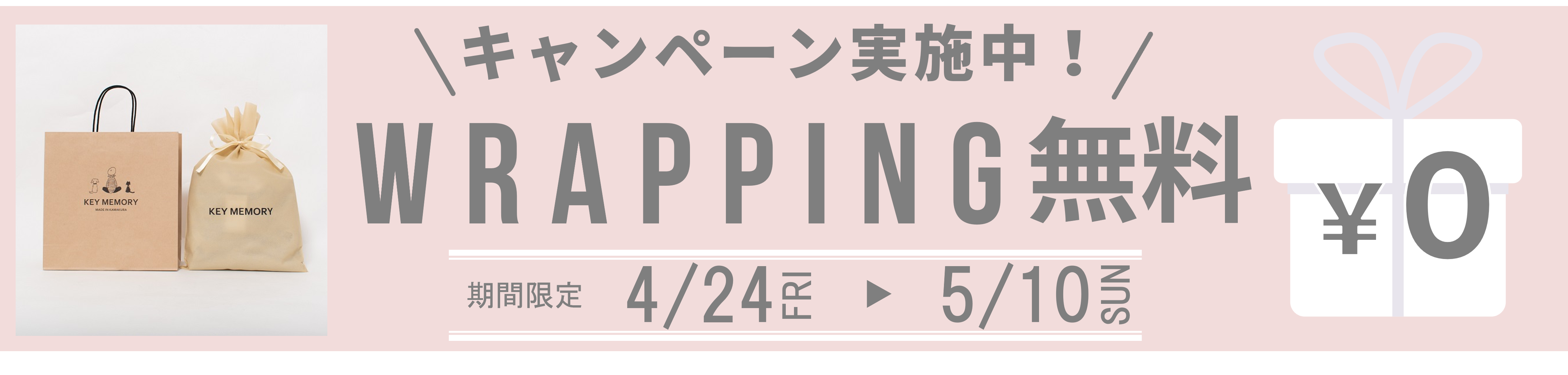 KEY MEMORY Online Storeでは、ギフトラッピングを1ラッピングにつき通常有料【150円(税抜)】にて承っておりますが、5/10までの期間限定でラッピング無料キャンペーンを実施しております◎ギフトバッグの大きさはご購入商品により、当店にて判断させていただきます。予めご了承くださいますようよろしくお願いいたします。