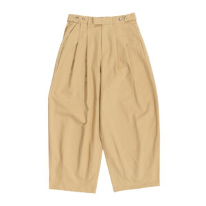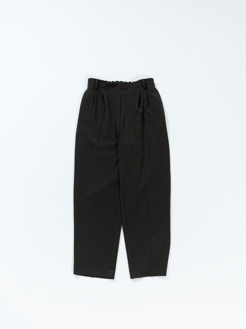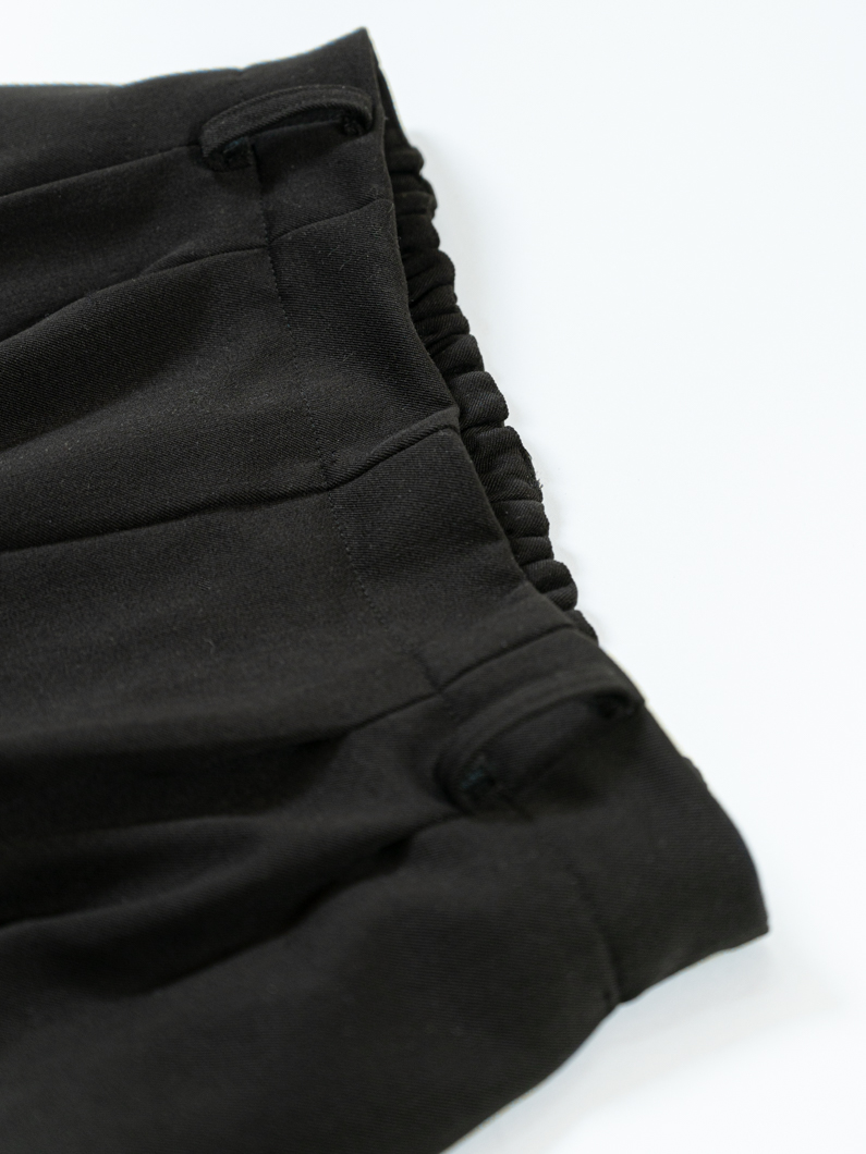 ボトムスは、膝から下に向かって少しずつ細くなるテーパードシルエット。背面にゴムを入れることで、窮屈さを感じずにご着用いただけます。ベルトループもあるので、お好みのベルトでウエストマークすることで背面ゴム部分が隠れ、苦しくないのにきちんと見えも叶います。