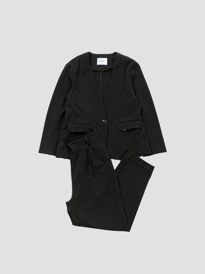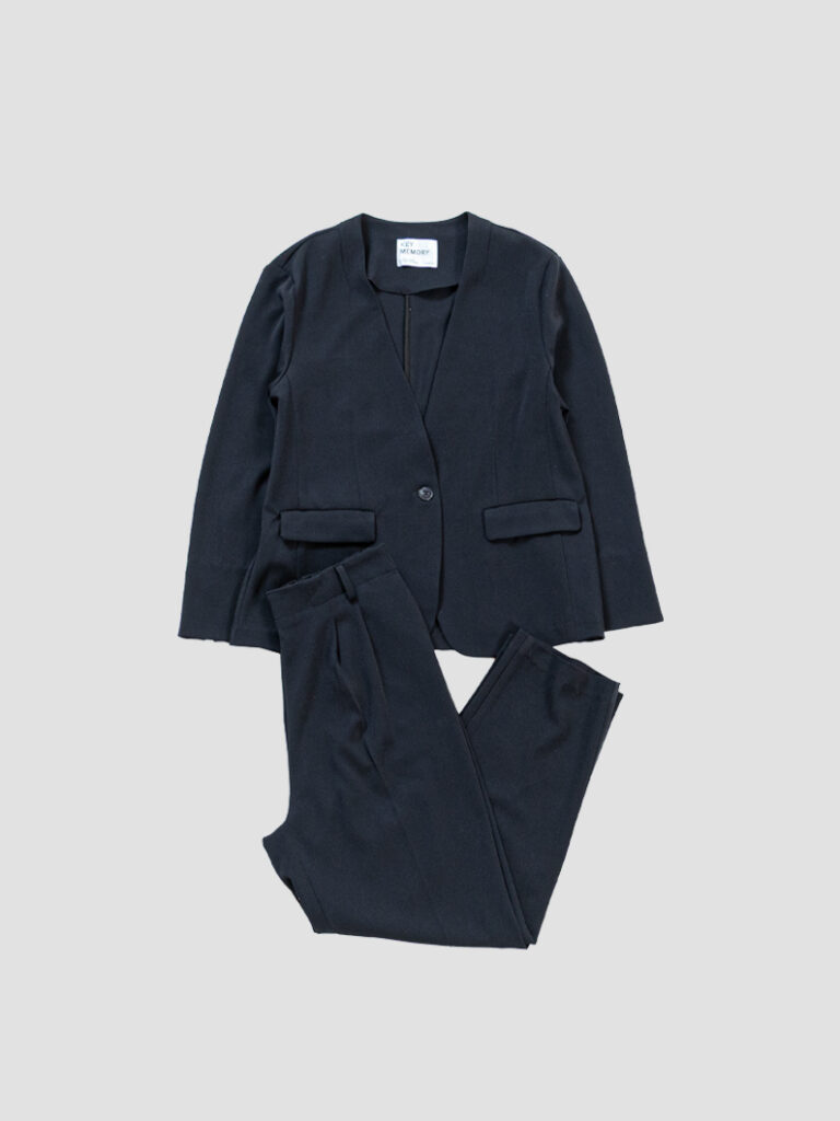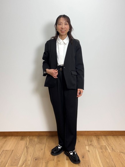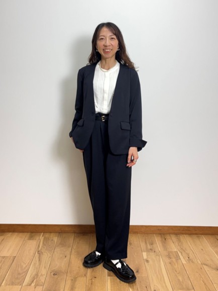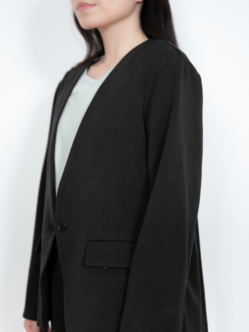 ノーカラージャケットは首元がすっきり見え、インナーを選ばず着回せるのが魅力。肩まわりが柔らかく女性らしい印象に仕上がり、ONスタイルでもOFFスタイルでも整った印象をキープできます。
