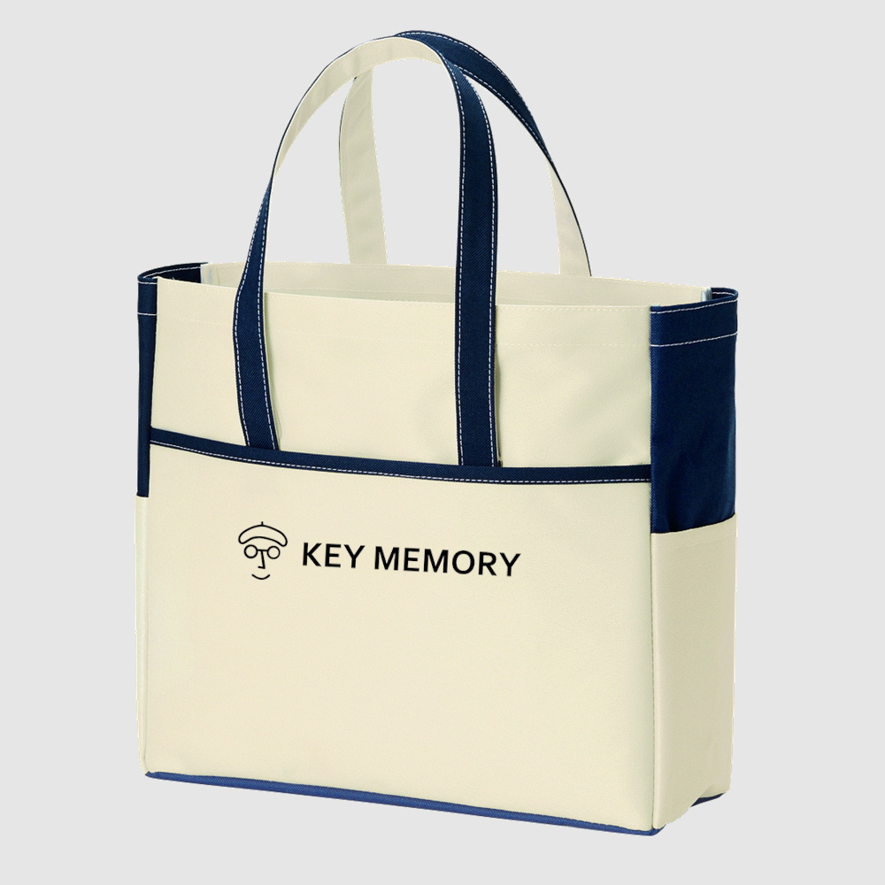 大丸 東京店POP UPのノベルティは、KEY MEMORYオリジナルコンビカラートートバッグです!しっかりとした生地で収容容量も大きく、サイドの収納ポケットにペットボトルも収容可能です。A4書類やPC等も安心して入れられ、いろいろな用途でお使いいただけるトートバッグです!