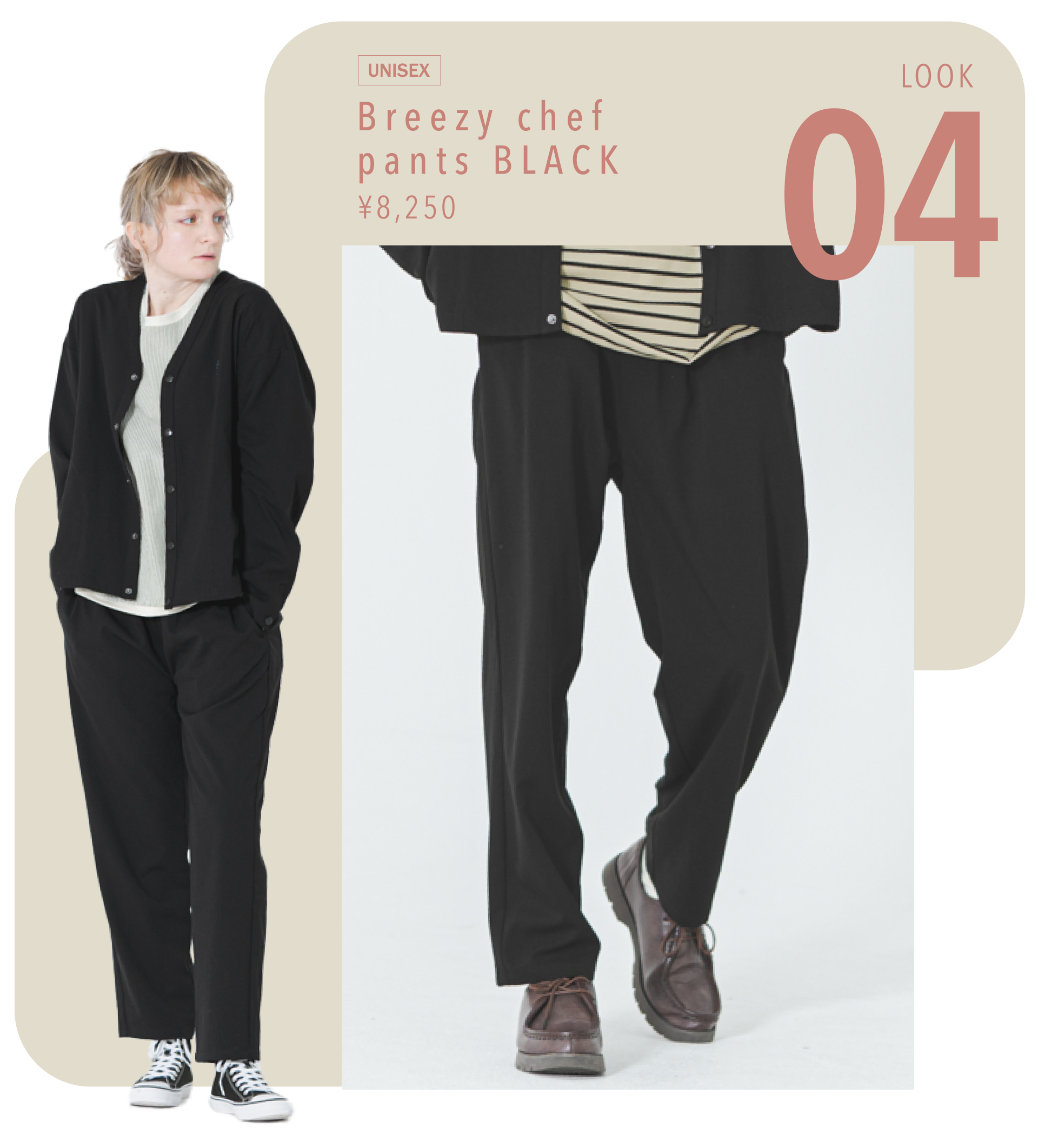 上下でセットにもできるカーディガンジャケットとシェフパンツ、