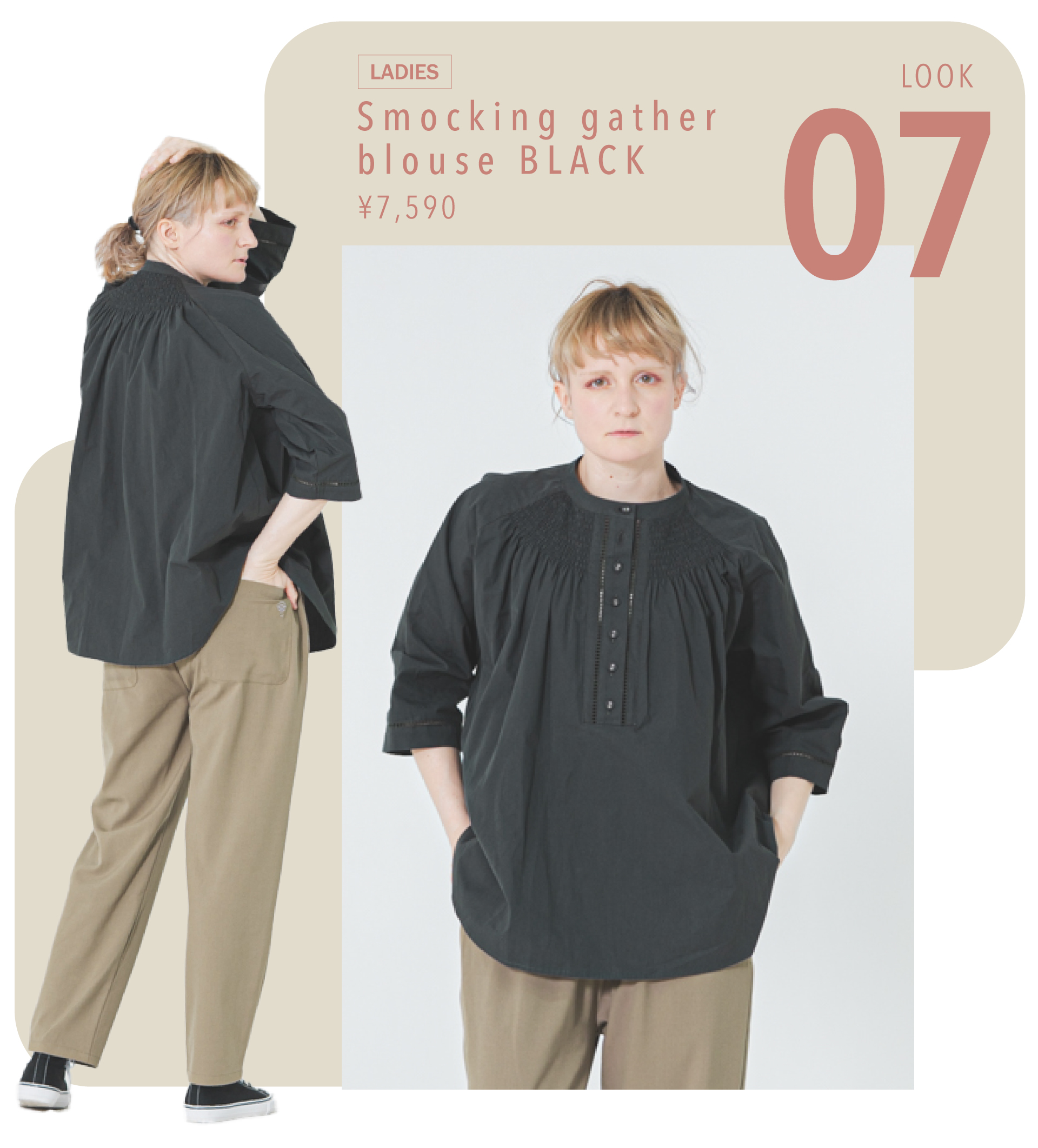 表情豊かなスモッキングギャザーブラウス、
