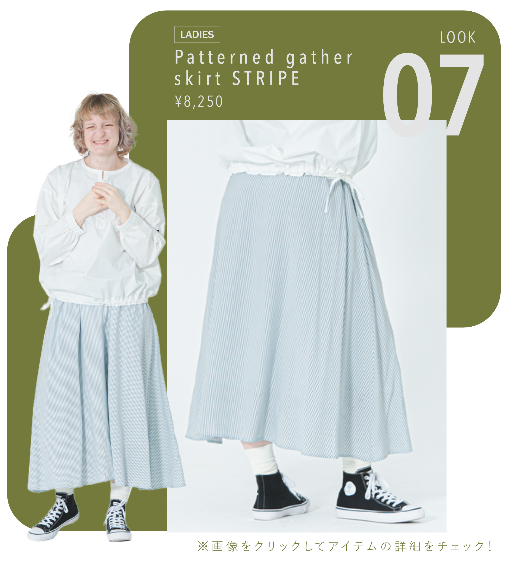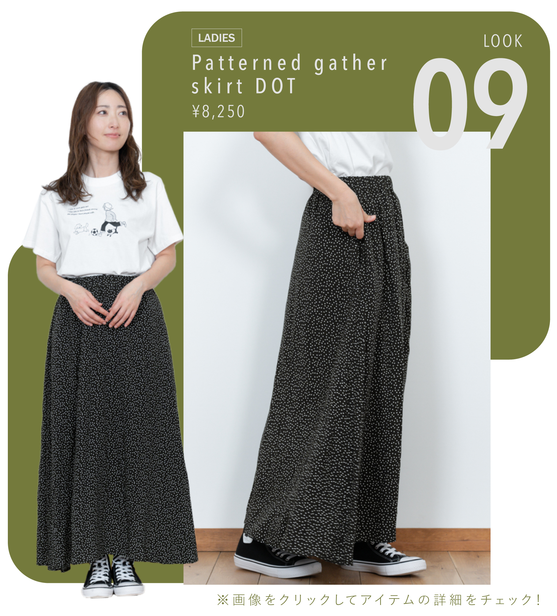 ふわりと広がるパターンギャザースカート。